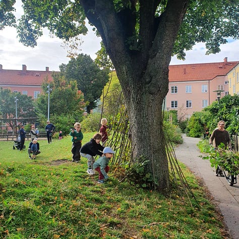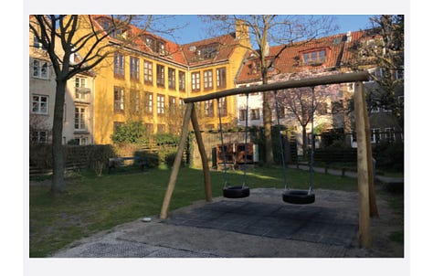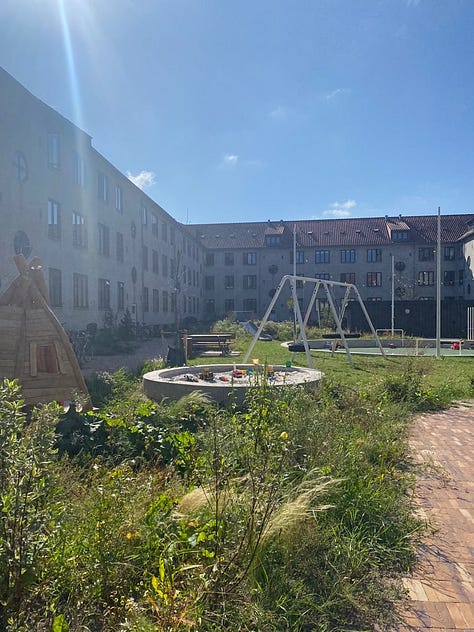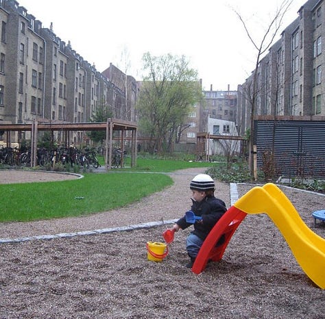 Play infrastructure, garden plots, and bike sheds are all signs that the courtyard is intended to be used by residents across the life cycle. Kids, bike commuters, gardeners.