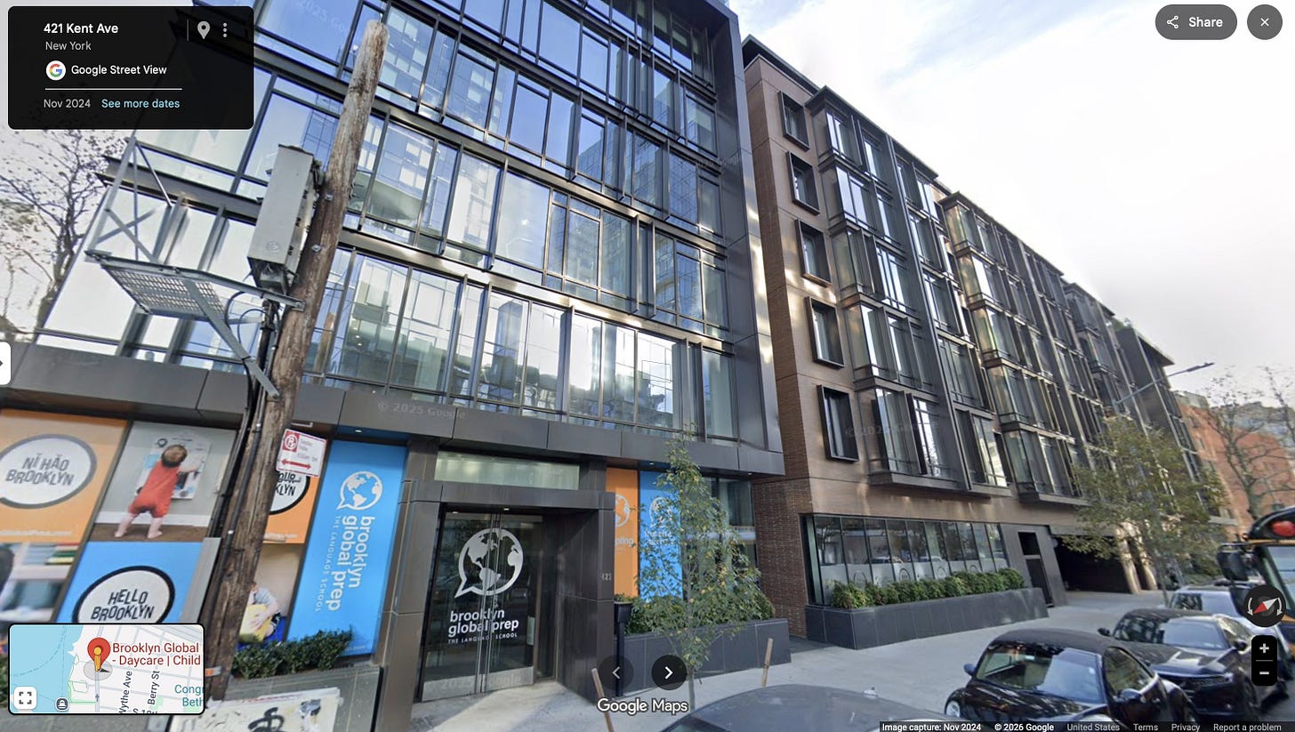 The building also includes roughly 10,000 square feet of ground-floor community facility space, currently occupied by Brooklyn Global Prep, a private school. This small institutional tenant demonstrates how ground-floor commercial or community facility space in courtyard block developments can accommodate neighborhood-serving institutional uses, even within predominantly residential projects.