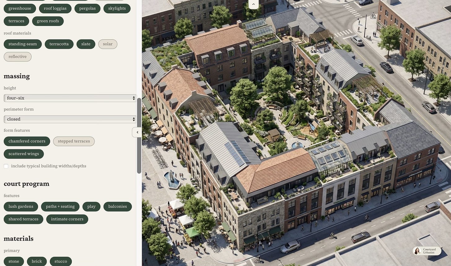 In design and design technology, the way buildings and urban spaces are conceived, visualized, and valued is evolving at an unprecedented pace. Treasury, a design technology firm co-founded by Zaha Hadid Architects, and development partner of Courtyard Urbanist, is enabling both enthusiasts and professionals to imagine courtyard designs both from first principles (new aesthetics even) and established premises. Whether from speculative concepts, context images, or constructible real technical drawings, sites can be reimagined, valued, and handed off directly to the new breed of validation and permitting tools, such as Arcol and Sybium–in seconds, not months.