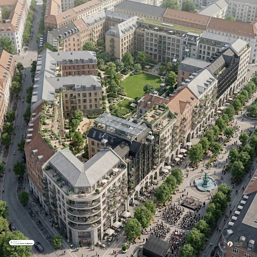 Courtyard Urbanism responds directly to this failure. Historically, the urban neighborhoods people most admire—whether in Copenhagen, Berlin, Vienna, or pre-war American cities—were built from mid-rise, single-stair, small-footprint buildings arranged around courtyards and streets that supported everyday life across ages and stages. These places were not one-off mega-developments; they were the default output of a regulatory environment in which building was routine.