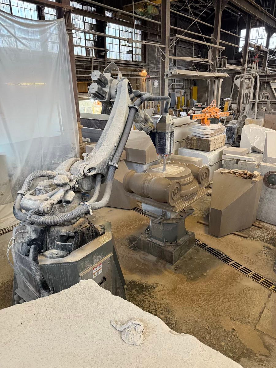 Technological advances will reinforce this shift. In fabrication and construction, for example, Monumental Labs is developing AI-powered robotic stone fabrication that dramatically lowers the cost of intricate stone ornament and structural elements while reviving craftsmanship that had become prohibitively expensive. Their robotic milling platform can automate stone carving and deliver highly detailed architectural features at a fraction of the traditional cost. Other techniques emerging include “printing” of concrete in forms equivalent to quality structural stone. On the construction side, emerging models led by firms such as Augmented Architecture replace centralized, high-overhead fabrication with compact on-site robotic mini-factories, supported by local labor. This approach reduces transportation costs, compresses schedules, and shifts labor from unpredictable site work to higher-skill fabrication and assembly.